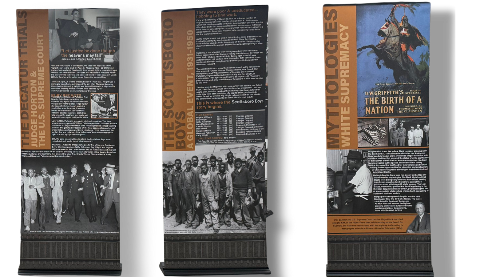 The travel exhibit consists of 10 banner stands. This display guides viewers through the social and historical context leading up to the scottsboro case AND the details of this pivotal civil rights event. We created this exhibit to extend a piece of our museum to communities around the world. our hope is to collaborate with LOCAL INSTITUTIONS/ORGANIZATIONS TO providE a free history exhibit for all ages. MOST IMPORTANTLY, WE WANT TO SHARE THE STORY OF THE SCOTTSBORO BOYS WITH AS MANY PEOPLE AS POSSIBLE BECAUSE WE BELIEVE THAT EVERYONE SHOULD KNOW THEIR STORY.